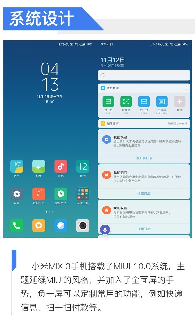 MIUI 10以全面屏设计为核心,虽然目前加入了全面屏手势,但仍有很多功能不够完善,像宣传的的滑盖设置,我手里这台小米MIX 3手机上并没有添加,每次滑动屏幕都是默认打开相机的操作,所以新一代的全面屏交互方式,并不能一滑即达,看来这个功能还不是很完善。