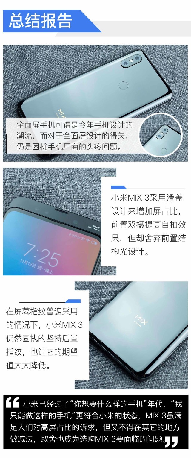 最被网友诟病的要属这个后置指纹了,千元机都开始进入了屏幕指纹的时代,小米MIX 3却还停留在后置指纹,没有做到滑动全面屏和屏幕指纹的两全,让这个滑动全面屏设计显得很鸡肋,毕竟MIX 3的屏幕指纹不得不为此让路。